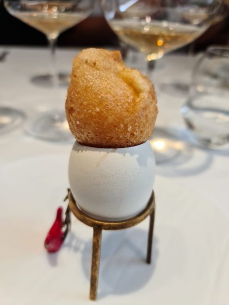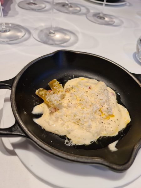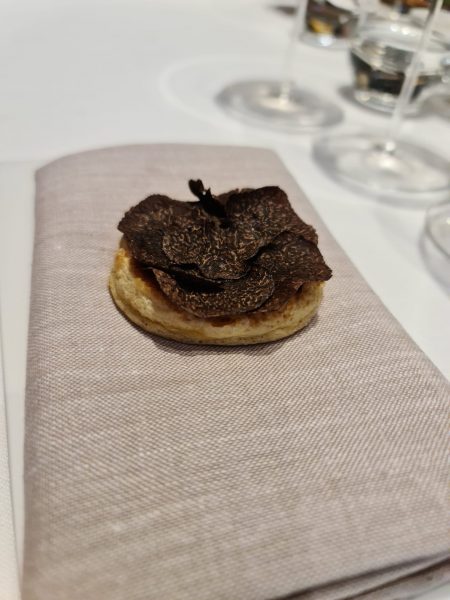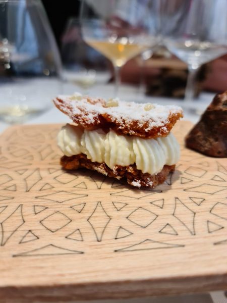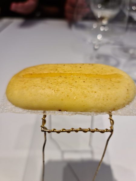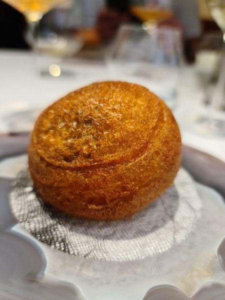 Il vodka / truffle – 2019 è un assaggio pazzesco. La sfoglia, tipo pane è realizzata solo con l’amido delle patate. I condimenti esplodono in bocca, ma la texture è veramente la cosa che fa la differenza. Altro passaggio tecnico importante per il bun cinese fritto con caviale e creme fraiche (panchino filled with caviar – 2016). Goloso fino a dire basta. La pancia ha il primo sussulto importante.