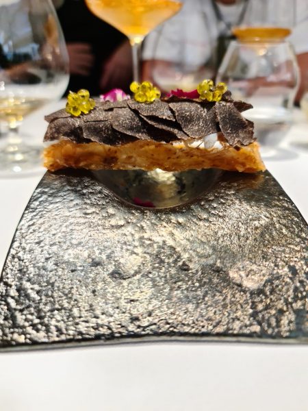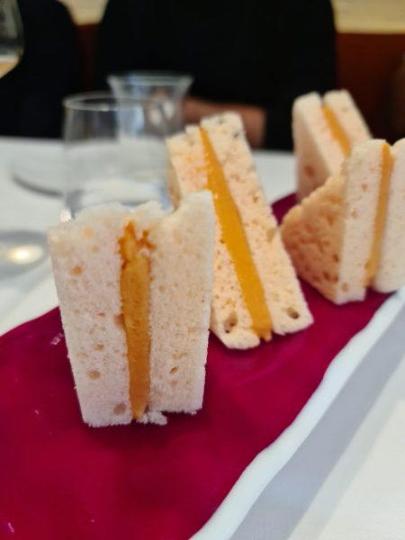 Ancora un inganno visivo per il sandwich di gazpacho (gazpacho sandwich with scented vinegar garnish – 2016). Il pane non è pane ma una meringa, un goccio di aceto di cherry rende il tutto brillante, per le sfumature acide. Passaggio goloso con il millefoglie di formaggio (Idiazabal cheese Mille – feuille – 2016). Prima di servirlo viene servito un bicchiere di sidro che viene affumicato davanti al cliente.