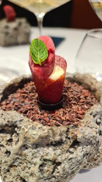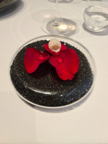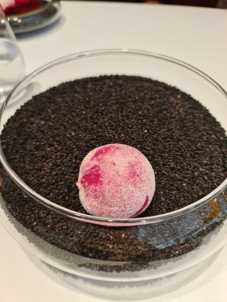 I primi tre assaggi sono un elogio alla tecnica ed alla trasformazione degli ingredienti. Quello che è, non è, quello che non può essere alla fine è reale. Una lingua di gatto gelata al frutto della passione (frozen passion friut, ladyfinger with rim – 2016) molto delicata, rosa e litchi (lychee and roses with gin – 2014), la meringa di barbabietola rossa (the beet tht comes out of the land – 2014).