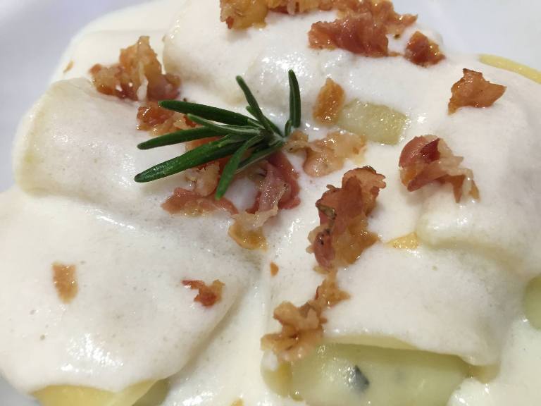 Gerani, Pasta e Patate, paccheri ripieni di patate con crema di provola affumicata, pancetta e rosmarino