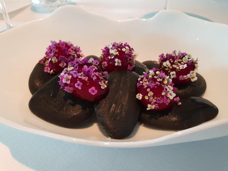 Geranium, a bite of beetroot, blackcurrant, yoghurt e tagetes