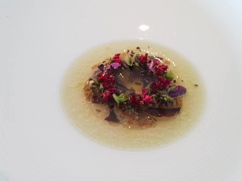 Non si può scegliere a la carte, perchè non c’è il menù, ma un percorso unico legato alla stagione: The Geranium Summer Universe. Il nostro pranzo è diviso in tre parti. La parte iniziale quella degli appetizers, parte con lobster, milk, juce from fermenteded carrots e sea buckthorn (aragosta, latte, gel di carote fermentate e olivello spinoso), tanta tecnica e un assaggio di mare in puro stile della new nordic cuicine. Semplice e goloso il creaspy leaves, walnuts oil e pickled walnuts leaves (foglie croccanti, olio di noci e foglie di noci in salamoia). Un piccolo capolavoro i razoe clam whit minerals, e sour cream (cannolicchi con minerali e panna acida) un boccone esplosivo, che lascia una sensazione di piacevolezza e di mare incredibile. Passaggio nei boschi con la soup from dried ceps, hops e dark beer (zuppa di porcini secchi, luppolo e birra scura). Le note amaricanti e aromatiche di questa zuppa sono talmente difficili che a tratti diventano golose. Chiudiamo la prima parte del pranzo con i beetroot stone scalopp e horseraddish (pietre di rapa rossa con capesante norvegesi da intingere in un consommè di rafano). Un gioco, di consistenze, dove la capesanta prende il in toto il gusto della marinatura.