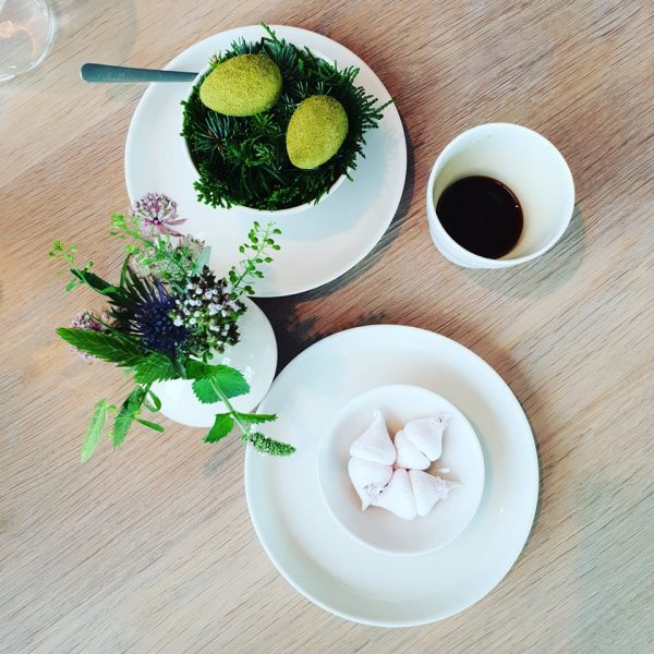 La seconda parte del pranzo al Geranium di Copenhagen sono i dishes, viene aperta dai riac, dried mussels, sol e juce fro, smoked yogurt (sedano rapa, alga sol e siero di yogurt affumicato) sensazione palatale lunghissima, note vegetali esaltate dalla leggera affumicatura. Assaggio geniale il cramy e dried trout, trout tartellet e juce from grilled cauuliflor (trota croccante e secca, trota tartelletta e juce di cavolfiore alla griglia). L’intensità della trota e del cavolfiore, senza alcuna pesantezza, per una concentrazione di gusto notevole. Rimandi francesi con il marbled hake, caviar e buttermilkù (nasello marmorizzato, caviale e buttermilk) rivisto in chiave nordica, con l’aggiunta di un pizzico di Giappone, infatti le squame del pesce, fritte, con l’aggiunta di olio bollente sopra, in modo da renderle croccanti. Per gusto, il pickled onon, onion plants e malted Vestarhavs cheese (cipolle sotto aceto, formaggio di malto e fiori) è quello che più si avvicina ai danesi, con la nota agrodolce a fare da trama, per un piatto dai sapori cangianti ad ogni boccone. La seconda parte del pranzo si conclude con le proteine, pesce e carne, perchè fino a questo momento a farla da padrone erano stati i vegetali. Il grilled langoustine, smoked cream cheese, beach herbs e juice from dried oyster (scampi alla griglia, crema di formaggio affumicato, erbe aromatiche e succo di ostrica essiccata) e il forest chicken, pickled blackcurrant leaves, juniper e aromatic herbs (pollo della foresta, foglie di ribes nero in salamoia, ginepro e erbe aromatiche) hanno entrambi il pregio di essere fatti con una materia prima vera, non omologata, dove le proteine sono protagoniste e spalla al tempo stesso delle note vegetali, entrambi meravigliosi.