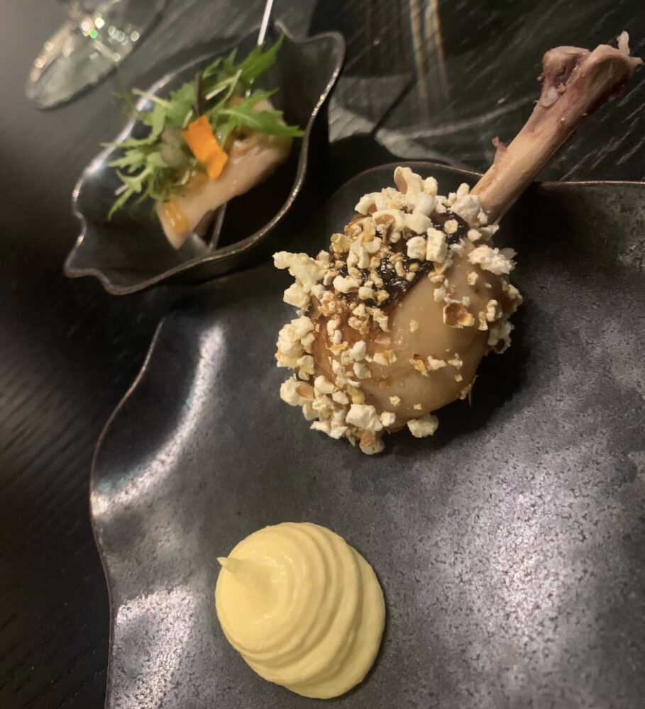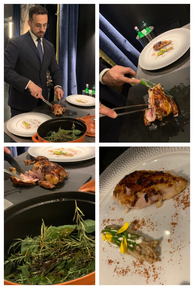 Il pollo in doppio servizio. La memoria va alla Poulard de Bresse dell’Ambroisie, ma anche a quello di Oliver Glowig all’Aldobrandi nei bei tempi che furono. Ma la tecnica e la morbidezza mi ha ricordato quello mitico del Nomad a New York. Un pollo cotto alla perfezione, presentato intero con due piatti.