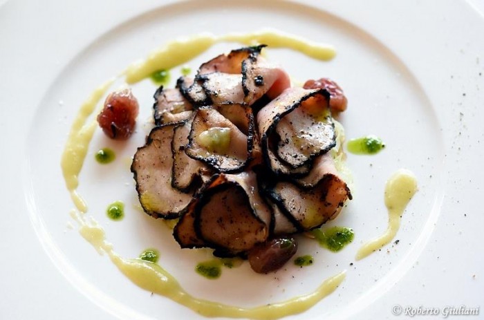 Restando nell’ambito degli antipasti, mi è piaciuta molto la “Crostatina di pasta etoile con carciofo spinoso, fondente di stracchino e crema di olive“, qui l’effetto avvolgente è dato dallo stracchino che sembra nato per affiancare il carciofo, la crema di olive e la friabile pasta etoile bilanciano perfettamente il piatto.