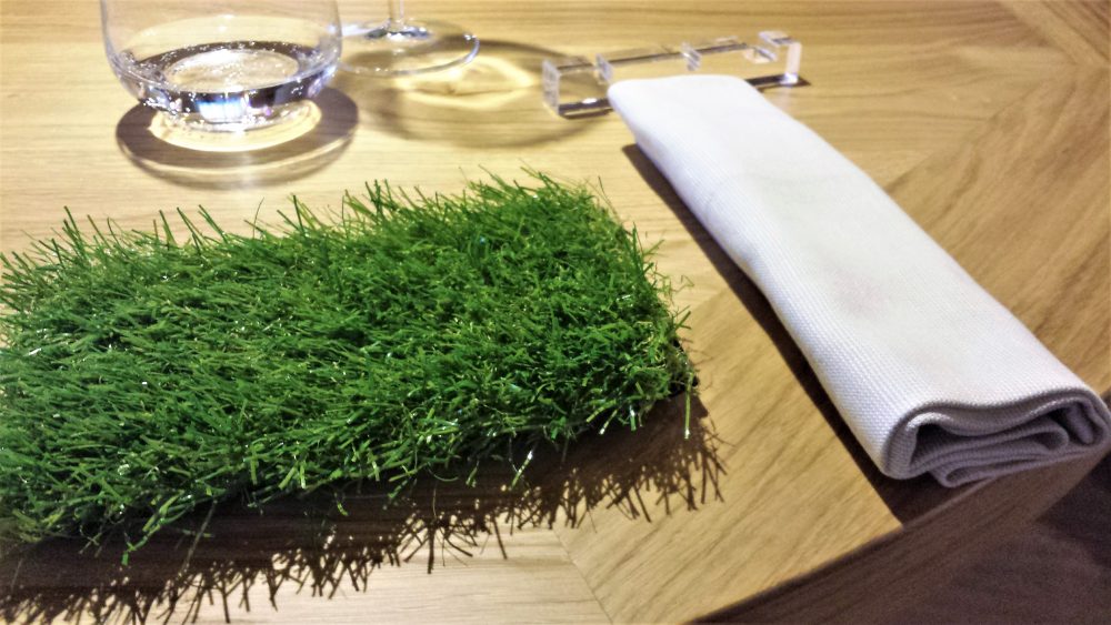 Cosa ci fa un piccolo grande rettangolo di prato verde su un tavolo di legno nudo?