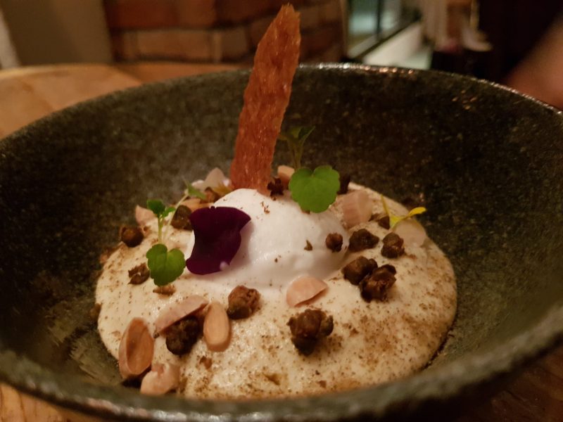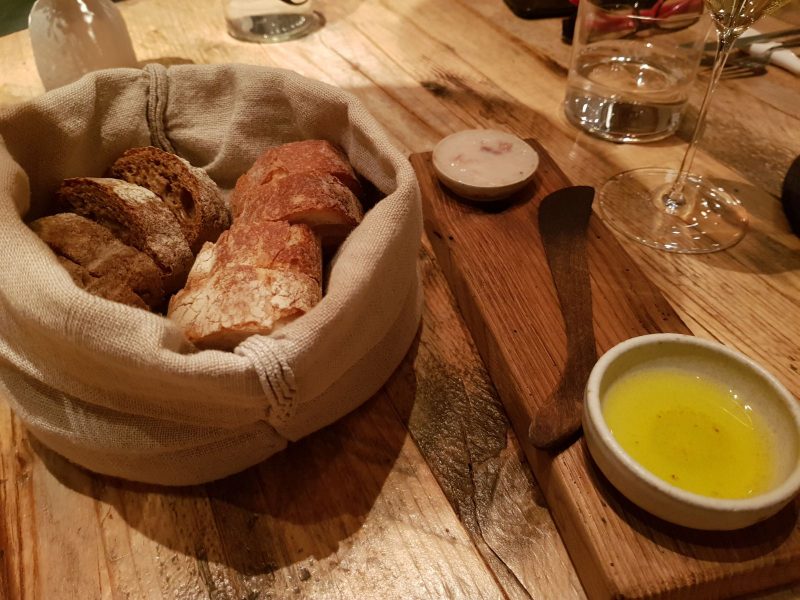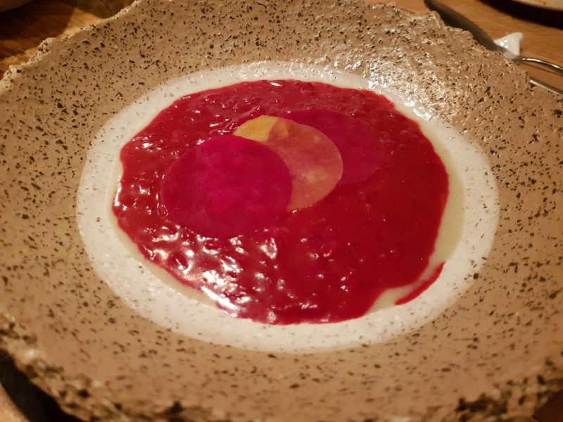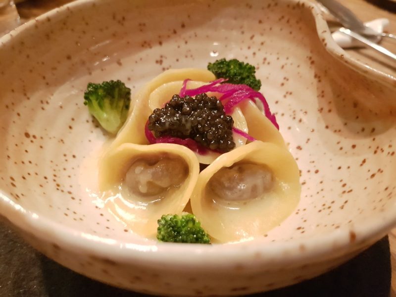 Aprono la cena i simboli della tavola italiana l’olio il pane e una coppetta di strutto che ripropone i sapori dell’ antica fettunta toscana. Gradevoli e divertenti gli antipasti: chips al nero con ceci, sgombro in saor, raviolo di verza e capperi, chips di barbabietola: spicca per freschezza e sapidità l’ostrica con sedano e pompelmo.