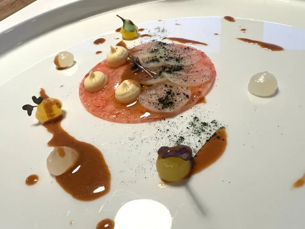Yacht Club – Carpaccio di gamberi rossi, sedano bianco, riccio di mare limone salato e placton