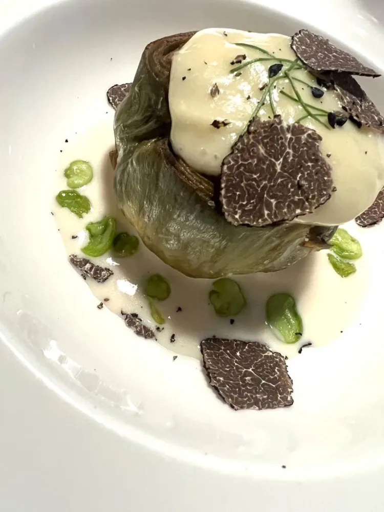 Yacht Club – Carciofo di schito, arrosto ripieno di soffice di patata, salsa di pecorino romano, tartufo