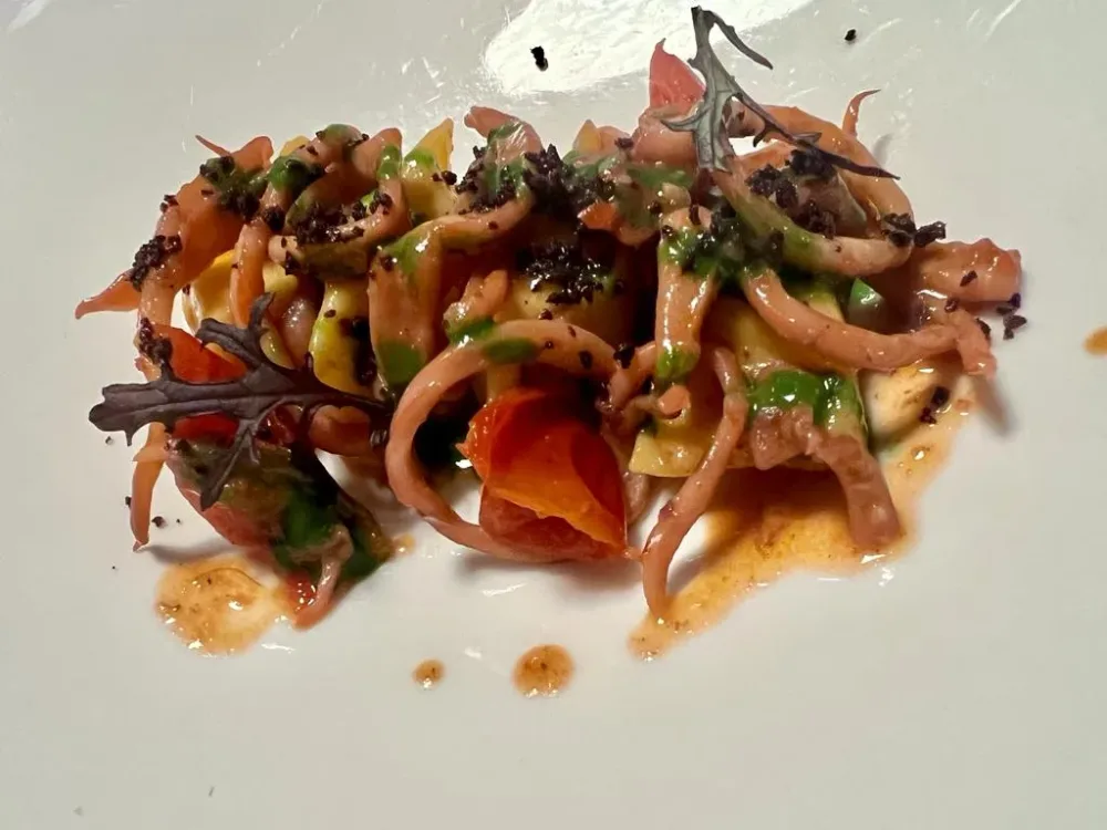 Yacht Club – Plin ripieni di patata rossa con totani, pomodoro del piennolo e olive