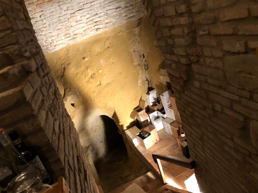 La Canonica, l’accesso alla cantina di arenaria, antico sotterraneo della Canonica della Curia di Pesaro, sotterraneo che ha la sua bocca in una delle sale del ristorante, le bottiglie riposano in questa grotta a temperatura costante di diciassette gradi e con l’ottanta per cento di umidità, il vino come dice Andrea Rignoli, l’appassionato proprietario e anima di questo luogo, è come se tornasse alla terra che l’ha generato
