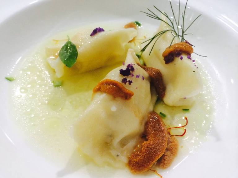 Arriviamo ai primi: fettucce con salsa di zucchine alla scapece e gamberi; gnocchi di patate e salvia con riccio e consommé di zucchine e zafferano; spaghetto al limone, con olive, muso e rucola.