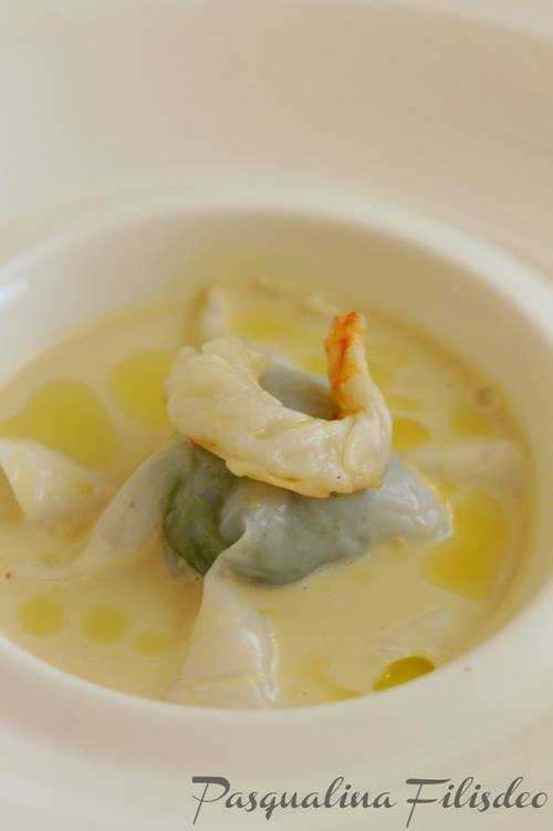 Si continua con il Raviolo di calamaro con tinniruma di cucuzza servito con salsa di acciughe e mazzancolla, piatto fresco, estivo. Due sfoglie sottilissime di calamaro racchiudono la farcitura che è composta dalle foglie tenere della “zucchina serpente” (o “cucuzza”), chiamata in questo modo a causa della sua forma rotondeggiante e molto allungata . Introvabile se non in Sicilia. Una scoperta!