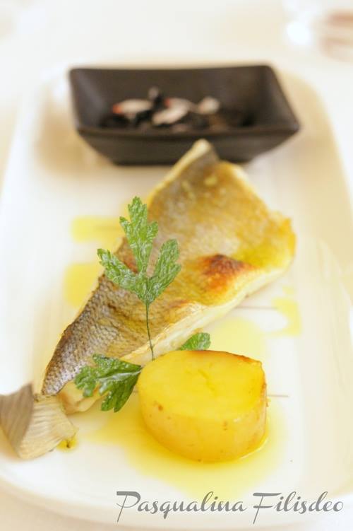 Conclude la carrellata la Spigola cotta alla carbonella di mandorle, la stessa carbonella viene servita nel piatto e ha una funzione visivo/olfattiva.” Anche qui semplicità ed estasi.
