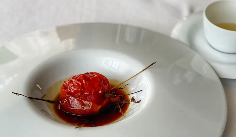 Colpisce di tutto il menù il Pomodoro Arrosto. Parliamo di un pomodoro, prodotto simbolo italiano, sempre un po’ ai margini nelle cucine d’autore dello stesso Paese di cui è l’emblema. In questo caso è cotto nel fieno fermentato con tre tipologie di aceto. Al palato la struttura è morbida ma si sente la fibra, sembra il ricordo di un pomodoro appena scottato pronto per entrare in un vaso di conserve. Si, sembra, perché è solo la sensazione del primo boccone. In realtà già nell’odore c’è la lieve distorsione da questa arcaica memoria casalinga. Il pomodoro ci sorprenderà per la complessità, un singolo vegetale in un piatto che stimolerà le papille sia in maniera tattile che aromatica arrivando a svelarsi per gradi, prima fresco, poi dolce, poi sapido, infine umami. Piatto bandiera della cucina vegetale di ricerca.