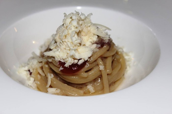 Il vero passaggio a vuoto della serata sono gli spaghettoni al burro d’acciuga, uva fragola e formaggio di fossa. Abbinamento inusuale però centrato, il problema era la cottura della pasta, veramente oltre.