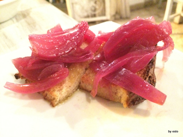 I crostini di pane con cipolle rosse candite in agrodolce fanno da spalla a dei gustosi peperoni verdi cornetto fritti e adagiati su un fresco pomodoro.