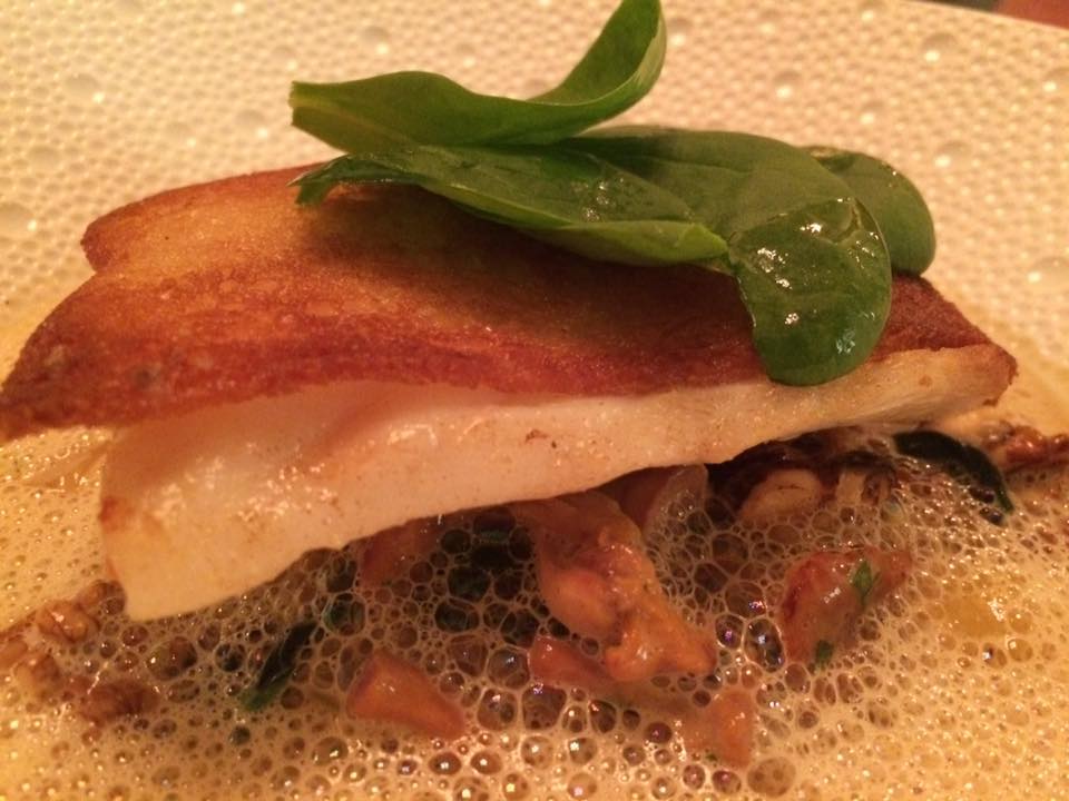 Les Climats, il branzino in crosta di pane con noci fresche e funghi