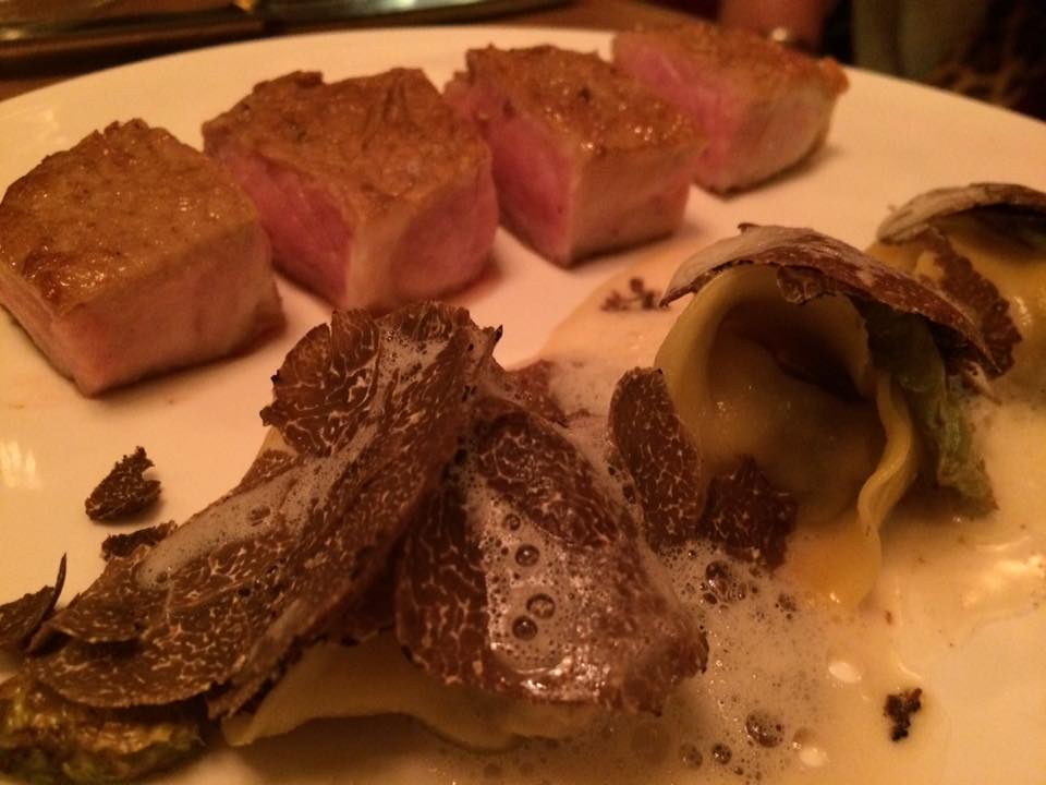 Nella norma i cubotti di vitello appena scottati, di un bel rosa all’interno, serviti con grossi tortelli di carciofi e lattuga grigliata, con un velo di tartufo.