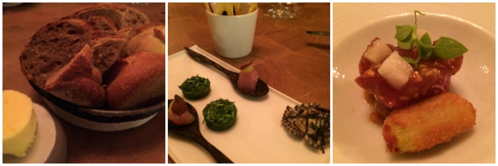 Si comincia con uno stuzzichino di benvenuto, con bocconcini di tonno e rucola che sollecitano il palato grazie a microscopiche iniezioni acidule e amare. E con un cestino del pane e un panetto di burro che ti fanno pensare sempre alla stessa cosa: sei nel Paese con ‘pane & burro’ più buoni dell’universo.