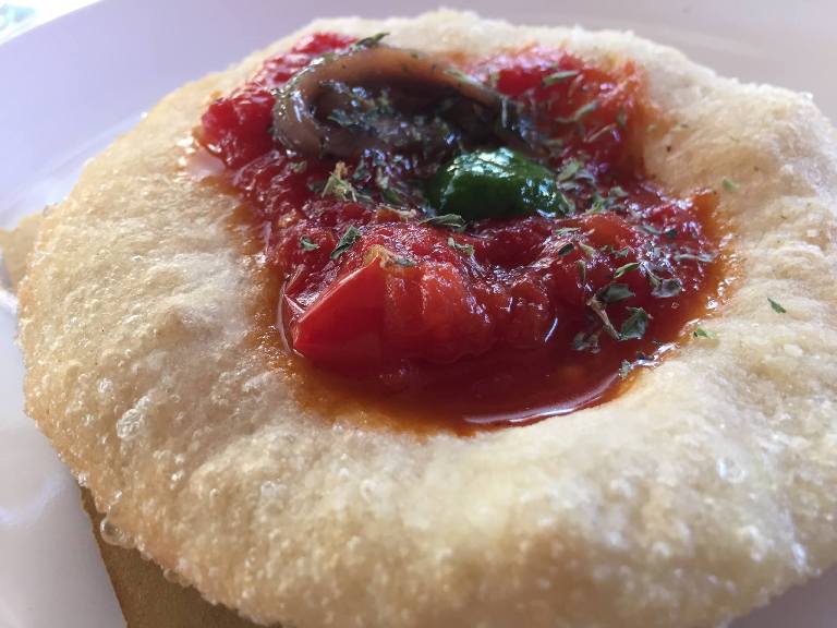 Senza mozzarella nè formaggio, poi, la versione cilentana della montanara: qui con pomodorini appena scottati, capperi odorosi, alici e origano di montagna. Davvero, se la dieta mediterranea avesse anche un profumo, sarebbe tutto racchiuso in un boccone semplice e goloso come questo.