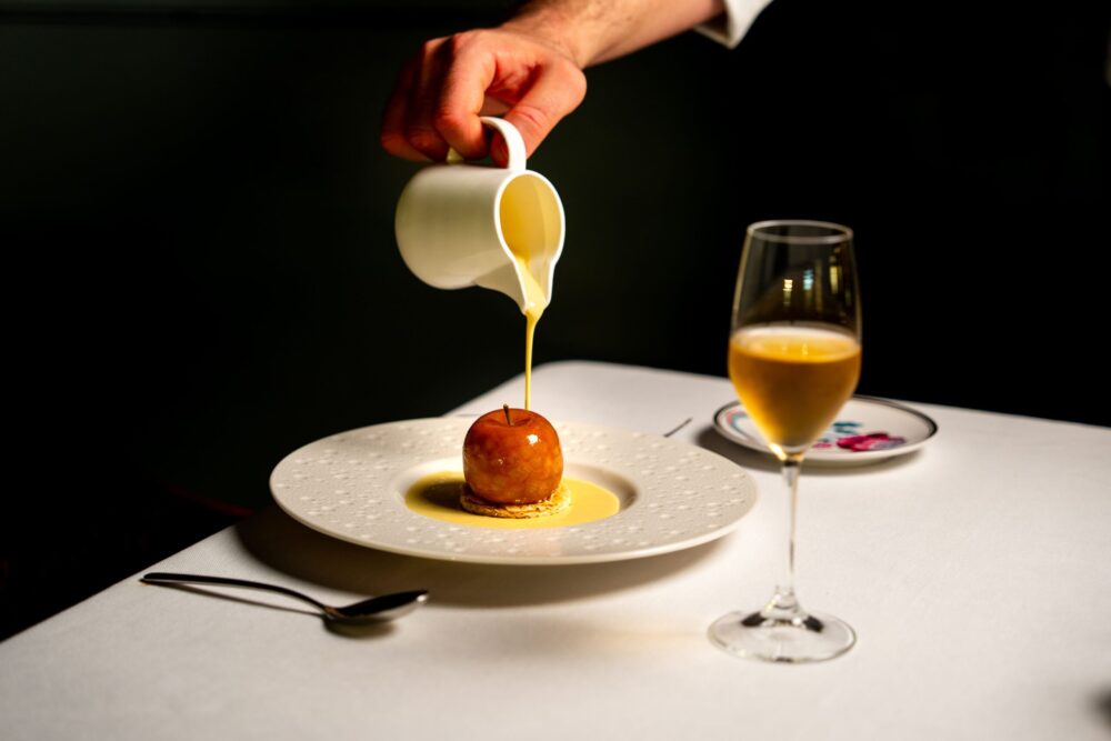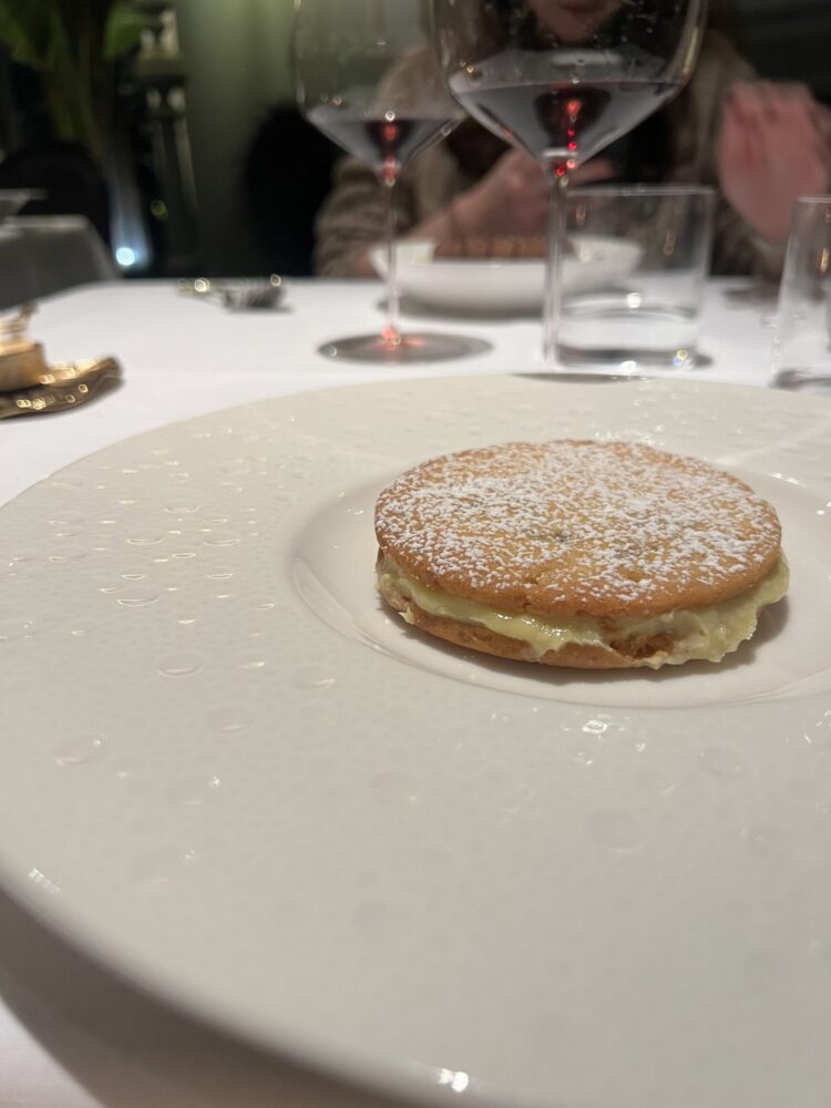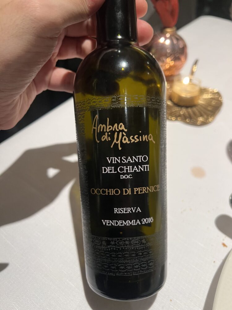 Dulcis in fundo, la carta dei dessert. Come dolce del territorio – oltre al Panforte e i cantucci – si trova la focaccia rapolanese, il cui nome trae origine proprio dalla zona di Rapolano: composta da due dischi di pasta frolla alle mandorle, al centro racchiude un cuore di crema pasticcera. Presente anche un dessert vegano, a base di cioccolato e noci pecan. Naturalmente, anche qui la carta dei vini può dire la sua, presentando una variegata offerta che spazia dai vini da ossidativi non fortificati ai dolci fortificati, come l’Occhio di Pernice (Vin Santo prodotto da uve Sangiovese, 2016 nel caso di specie, dell’azienda Ambra di Massina).