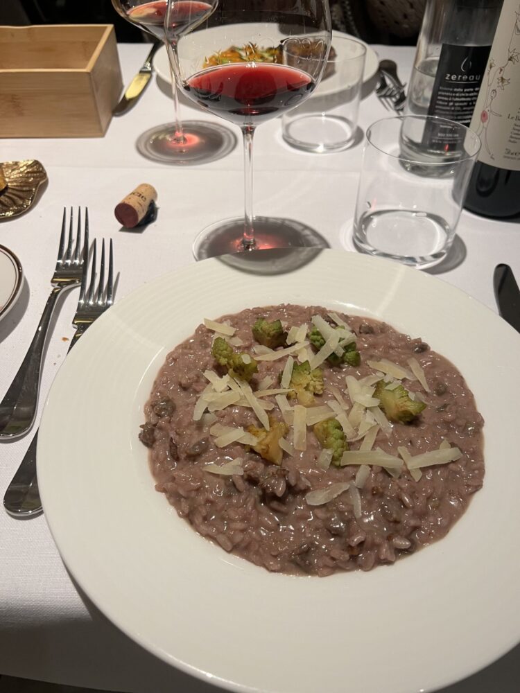 Spostandoci successivamente sulla proposta gastronomica, ci imbattiamo fin da subito in una selezione di salumi e formaggi che raccontano il territorio. Si trovano sia taglieri di Cinta Senese e Chianina (da allevamento brado della macelleria Fleri) sia di Pecorini di Pienza, con tre differenti stagionature e serviti insieme a diversi prodotti, tra cui il miele di Podere Nereto. E ancora si può ordinare un tagliere di Tarese del Valdarno (presidio Slow Food): si tratta di una pancetta ottenuta dalla schiena e dalla pancia del maiale, arricchita dall’arista e lavorata con aglio, pepe, ginepro e altre spezie, poi stagionata per mesi. Vi è anche una sezione dedicata alle minestre con tre proposte, di cui due vegane. La scelta dei primi prevede una maggioranza di piatti che raccontano la Toscana, ma che strizza l’occhio anche a proposte non regionali. Tra tutti, spiccano i tipici pici al ragù di chianina. Interessante e ricco di contrasti il risotto (riso Acquerello) al Sangiovese, con salsiccia, cavolo romanesco e scaglie di Pecorino.