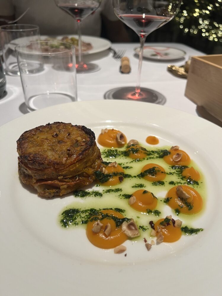 Ciò che ulteriormente affascina e richiama quella sensazione di leggerezza post trattamento benessere è la proposta di secondi piatti vegetali: la millefoglie di zucca con nocciole e salsa verde (piatto vegano) è un’ode all’autunno, scioglievole e mai stucchevole, in quanto la tendenza dolce della zucca è ben gestita dalla parte verde del piatto.