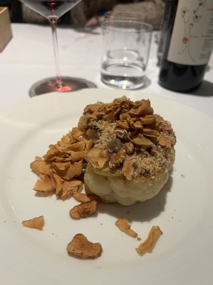 E ancora la bistecca di cavolfiore, cotta a bassa temperatura e poi grigliata, servita con una salsa ai funghi, noci e topinambur fritto: un trionfo di consistenze e umami, che ad ogni boccone diverte il palato. Ritorna, infine, il Tarese, questa volta di fianco al pollo. Il menù, inoltre, prevede tra i primi e secondi delle proposte di pesce, che contemplano sia crostacei che pesce a carne bianca.