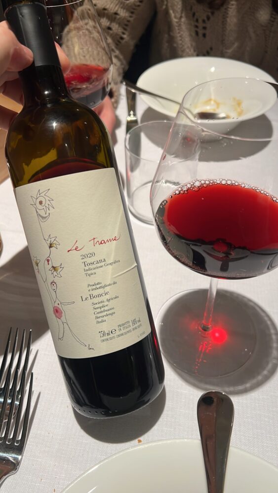 La filosofia aziendale si riflette in ogni dettaglio del ristorante: valorizzazione delle piccole aziende che esprimono al massimo il terroir nella carta dei vini, rispetto della stagionalità degli ingredienti, produzioni artigianali e prodotti presidi Slow Food nel menù. In particolare, la proposta enoica, privilegia aziende e vignaioli personalmente incontrati – a riprova della valorizzazione del legame con il piccolo produttore – ed offre un’ampia scelta tanto orizzontale, quanto verticale, proponendo diverse annate della medesima etichetta. Esempio ne è il vino provato in occasione della nostra visita, Le Trame (podere Le Boncie) di cui erano disponibili varie annate, tra cui la 2019, 2020 (già pronta ed elegante) 2021 (più austera e da attendere) e anche 2022.