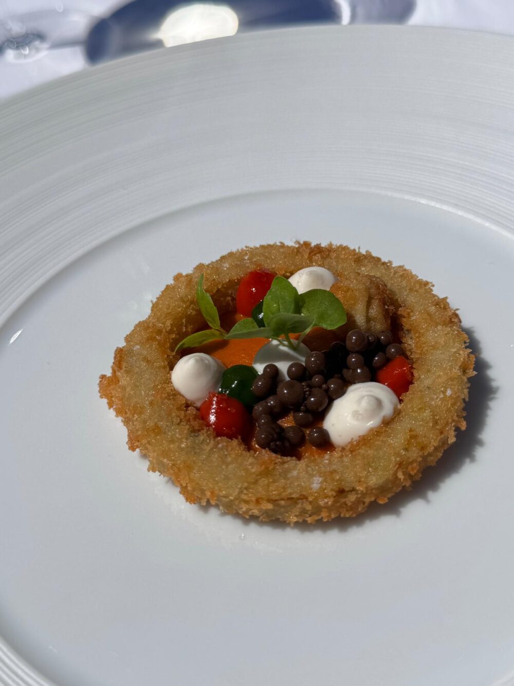 Tra gli antipasti, spiccano: un crudo di gamberi rossi appena scottati, avvolti da intrecci di seppia e accompagnati da lardo di mare, piselli e finger lime, un lingotto di sogliola cotto nell’acqua pazza con purea di patata e un guazzetto di mare e una sorprendente corona di melanzana panko farcita con crema di parmigiana, ricotta affumicata e caviale di aglio nero. Quest’ultima forse è stata la portata più ingannevole della degustazione. Sembrava tutt’altro e solo dopo averla assaggiata è apparsa nella mente la nonna che preparava le melanzane per la parmigiana. Un gioco divertentissimo che lascia un sorriso sulle labbra e un senso di felicità nel cuore.