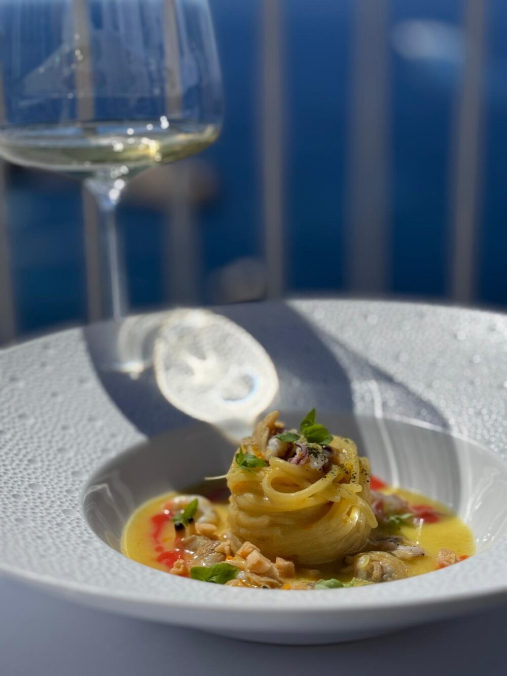 Si prosegue con entree raffinati, come la tartare di dentice con fiori di zucchine e i salumi di mare affumicati al rosmarino, già preludio di un equilibrio raro tra eleganza e profondità. Dal balcone del Lorelai si tocca decisamente il mare senza muoversi dalla sedia.