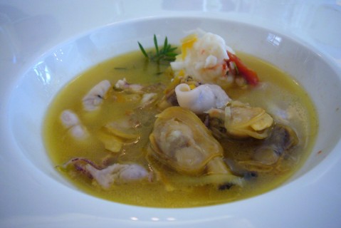Identica filosofia nella seconda portata, semplicemente corroborante, un brodo pulito, vegetale e marino, di gran classe, dove si gioca anche con le consistenze in modo semplice e piacevole.