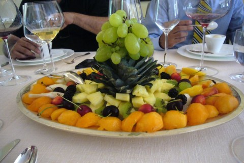La scansione italiana delle portate è definitavamente persa, ma qui la ritroviamo. Ormai ovunque è batteria di antipasti pre-parati, assaggino ospedaliero di primo, salto del secondo divenuto il convitato di pietra in ogni pranzo, finale dolce in più portate.