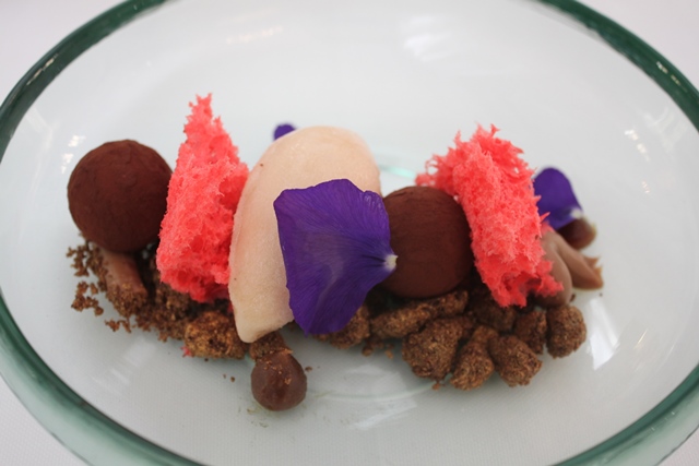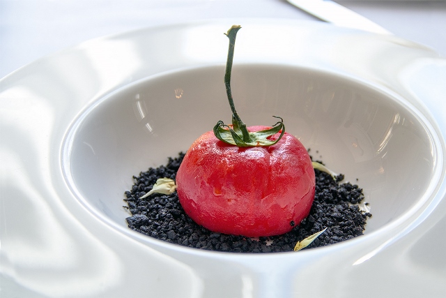 Passando ai secondi, il menu propone “Polpo arrosto, gel al pomodoro, sfera di basilico, cipolla di Tropea leggermente caramellata e crema di patate novelle di Avezzano”. Una interessante rivisitazione della versione alla catalana: il polpo è cotto a bassa temperatura e rimane molto croccante, con la crema di patate che diventa quasi un velluto alla base del piatto. Il pachino arancione e la cipolla dolce marinata conferiscono freschezza al piatto. Per concludere, le sfere hanno una consistenza particolarissima, “rivestite” da una pellicola che scoppia in bocca in un’esplosione di gusto. Per questo secondo piatto, il Sommelier consiglia di abbinare un Verdicchio dei Castelli di Jesi Superiore Rincrocca 2015 della cantina La Staffa.