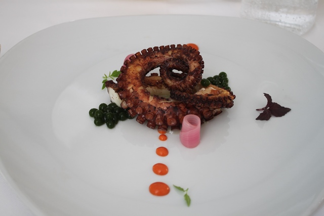 Hotel Majestic – Polpo arrosto, gel al pomodoro, sfera di basilico, cipolla di Tropea su crema di patate novelle