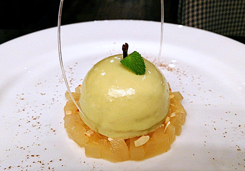 La Mezza Mela: mousse agli agrumi ripiena di caramello liquido salato, su una base costituita da pezzetti di mela marinati con limone e mandorle.