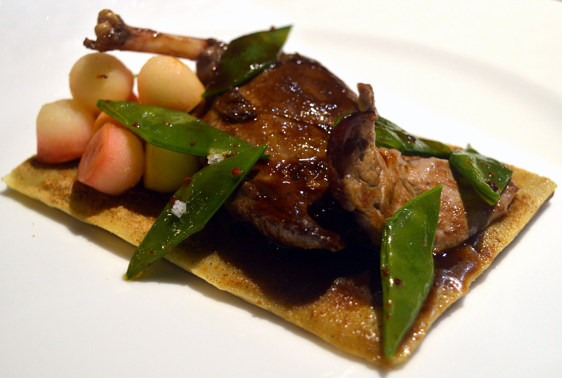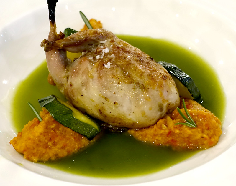 Quaglia ripiena di faraona grigliata, pappa di peperoni ed estratto di mela verde.