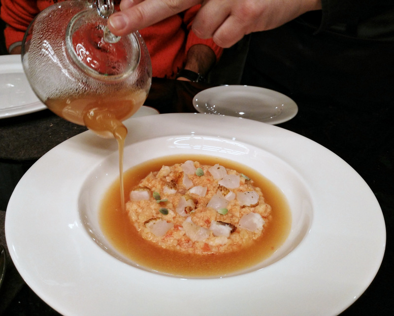 Risotto di riso Carnaroli Ferron cotto nell’acqua di pomodori uzbeki grigliati su una griglia a carboni naturali e dunque frullati, con all’interno una bavarese di mascarpone e limone. La mantecatura si fa inserendo il cucchiaio nello specchio rosso, che subito viene investito dal luminescente biancore della bavarese. Esperienza sensoriale splendida, indescrivibile.