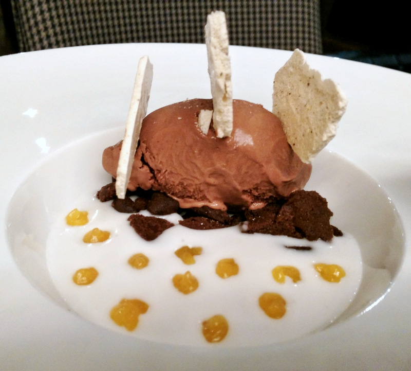 Ristorante Maritozzo a Mosca. Zuppetta fredda di cocco con gelatina di frutto della passione, meringa alla liquirizia e gelato al cioccolato