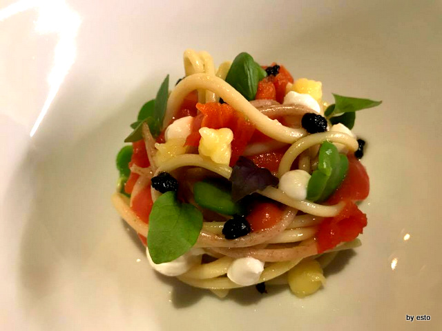 Si passa all’ Inizio (ex-primi) con lo Spaghetto 3.0, cioè spaghetti in tre varietà di frumento, massaggiati in olio evo biologico, mango, aglio nero e spuma di bufala campana Dop, fave vesuviane, essenza di thè verde.