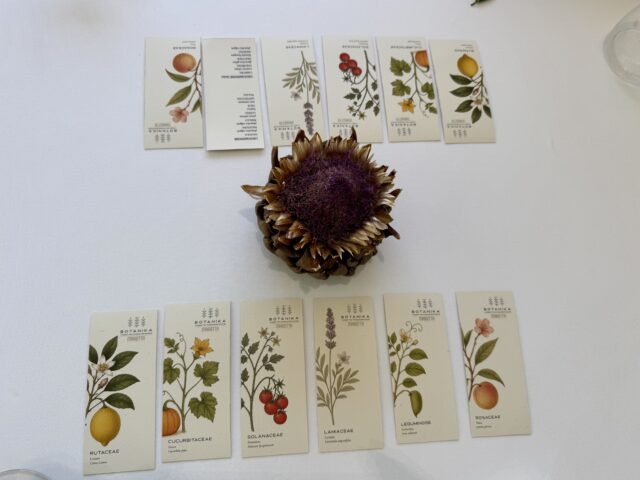 Rosacee, leguminose, ombrellifere, solanacee, asteracee, cucurbitacee, rutacee: ogni famiglia botanica diventa la base di un racconto gastronomico e l’elemento spiazzante del menu, quello che rimane più impresso.