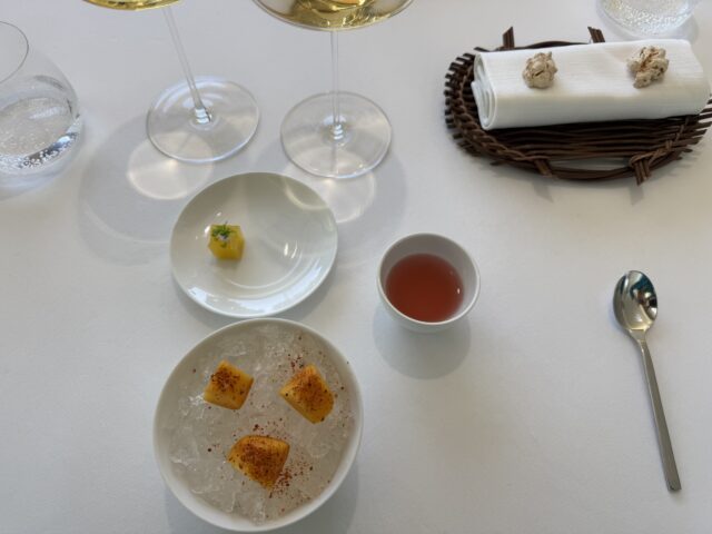 Si inizia con il benvenuto composto da melanzana in agrodolce, cimetta verde con senape e furikake, salicornia, mandorle fresche e riccio di mare, maiale al quadrato, cips con conciato romano, baccalà mantecato, spiedino di lumaca con amaranto soffiato e crema di aglio, gamberetti e polvere tandori.