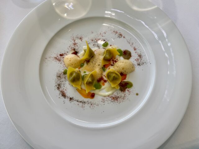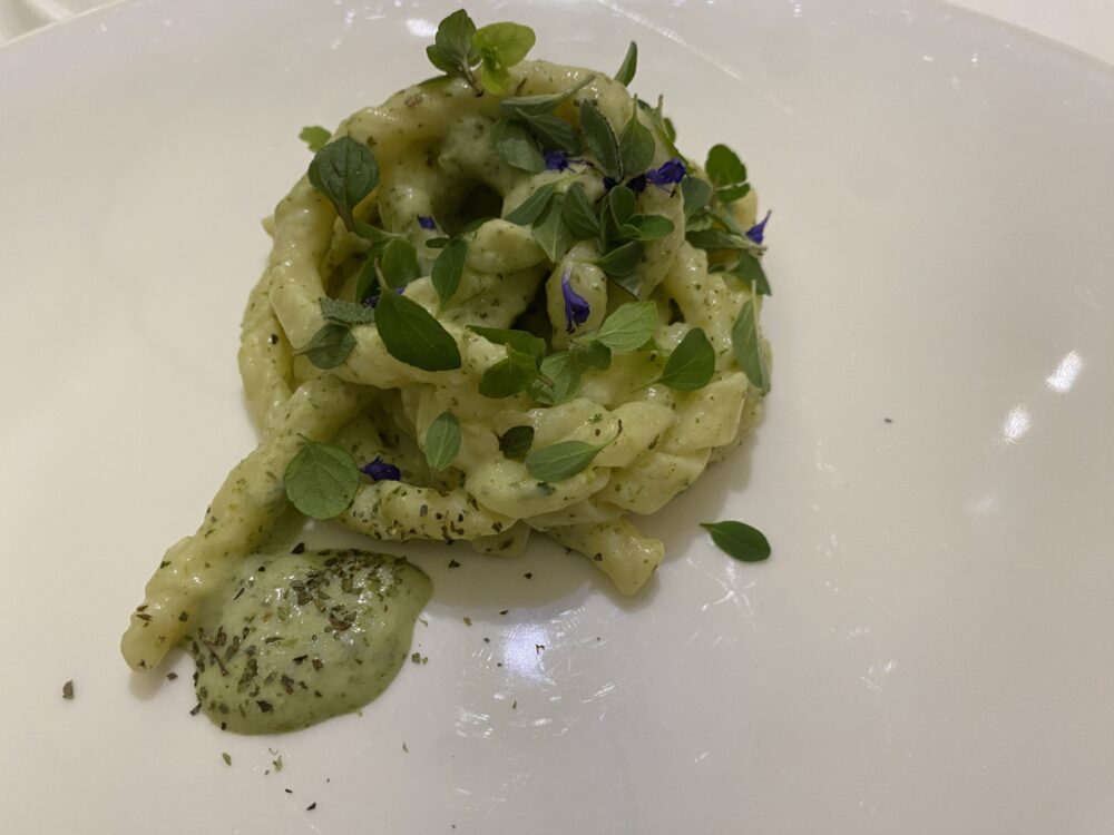 Tuttavia, il campione s’è visto nel piatto successivo: fusillo al ferretto, laminaceecaprino e lime. Il tripudio di lavanda, menta, origano, maggiorana, santoreggia, timo, melissa, salvia, rosmarino, nepeta ha illuminato quello che, prbabilmente, per chi scrive, è il piatto di pasta dell’anno. Uno di quelli per cui si dice, “vale il viaggio”.