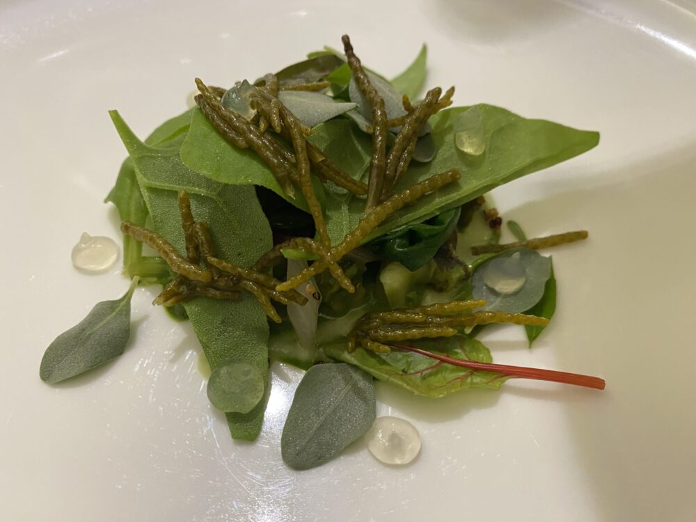 Entrèe: Melanzana e Maggiorana; Consommé di Zucchine alla Scapece; Insalata di Pomodoro Gel; Bieta e Furikake Campano; Lattuga e Cappero; Carotina e Gomasio; Fiori di Zucca in Tempura e Tandoori; Mantecato “Mediterraneo”; Cotenna e Guanciale di Nero Casertano; Lumache Aioli.