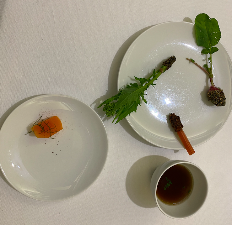 Ristorante Marotta – Canape’, Zucca marinata e Salvia, Bruxelles alla Senape e Crescione Carotina – Indivia – Bieta e Furikake Ahi Consomme’ di Funghi Baccala Mantecato e Acetosella Verde