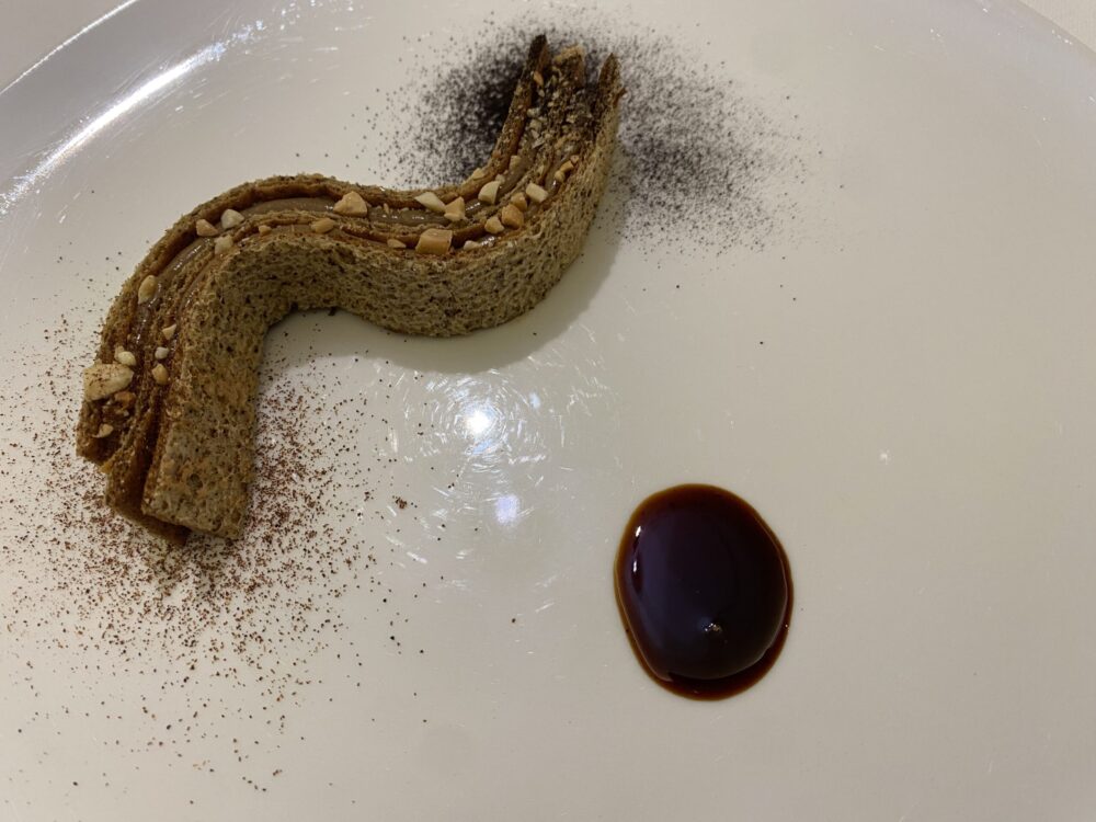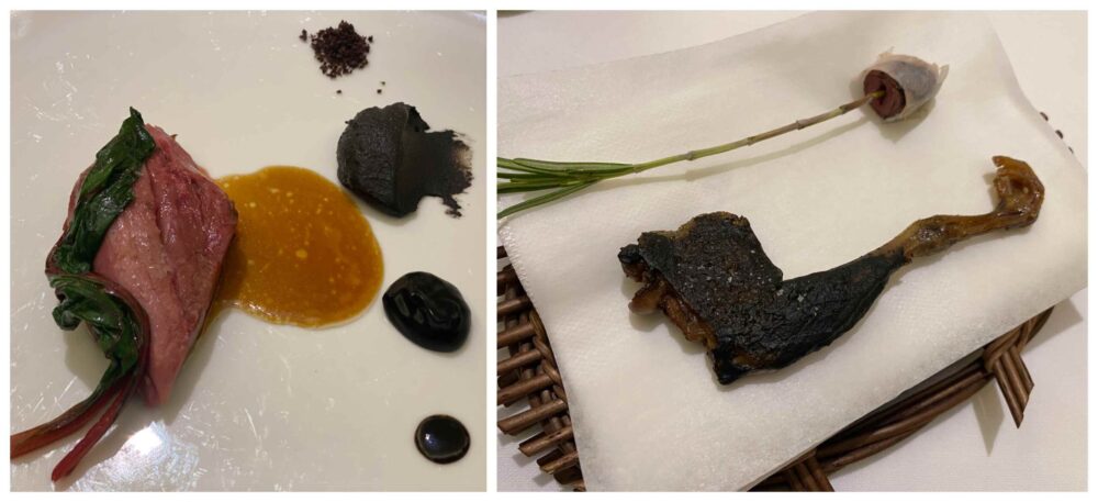 Preceduti da due piatti di alta tecnica e tanto sapore, in particolare il merluzzo e verza che è una riedizione del “baccalà con verza” della mitica Trattoria Di Pietro (citata nella presentazione), davvero fantastico, mentre l’uovo ci riporta all’illusionismo estetico di Nino Di Costanzo.