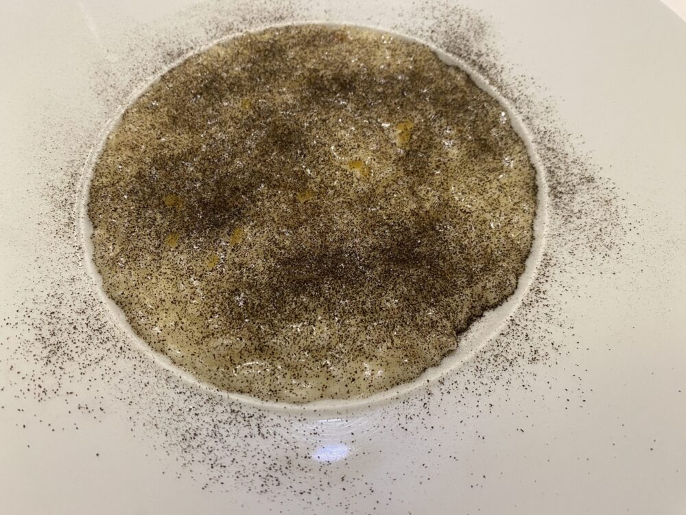 Il risotto provola, lapsang e limone al sale è stata una precisa richiesta per capire se uno chef campano sapesse confezionare alla stessa maniera dei colleghi del nord Italia il più settentrionale dei primi piatti della tradizione italiana. In verità, essendo stato allievo di Enrico Crippa, la domanda non era forse nemmeno da porre. Una cottura perfetta per un piatto moderno, cui forse mancava solo un pizzico di acidità.