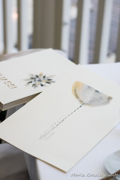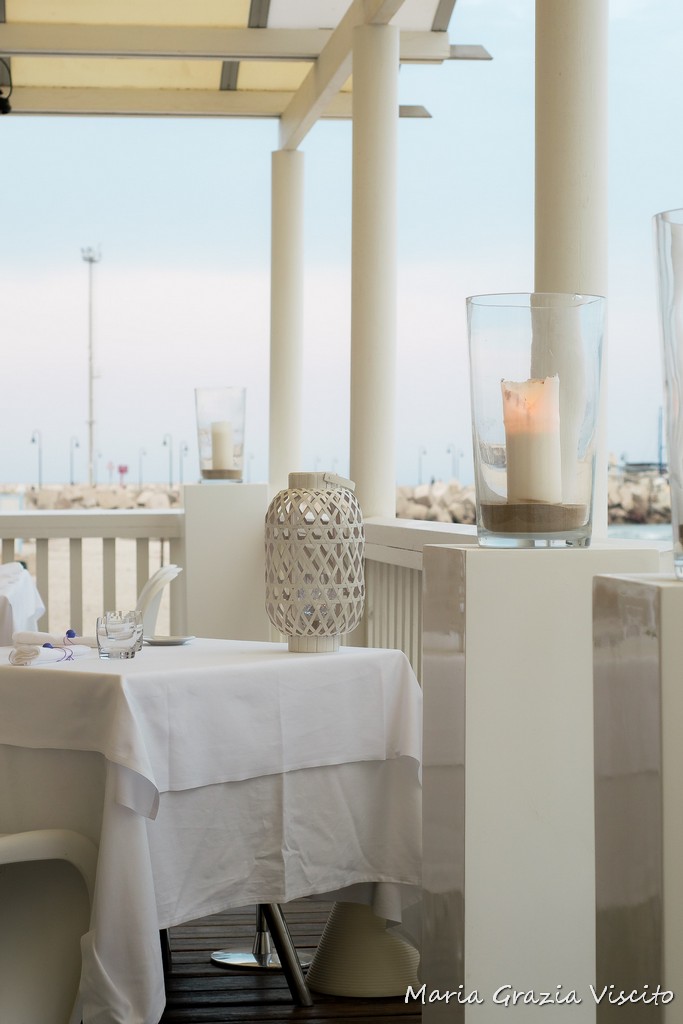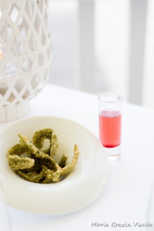 Partiamo dall’essenziale: i particolari. Locale splendido, sui toni del bianco e rosso, con una terrazza sul mare di Senigallia che d’estate riporta ad un’atmosfera suggestiva. Tavolo in bianco, menù dipinti a mano da Catia Uliassi (e volendo si può acquistare, devolvendo in beneficenza, i menù bonsai per i collezionisti), lanterna, laccio elastico con sfera di vetro lilla che racchiude il tovagliolo, e il senso estetico sentitamente ringrazia. Da Uliassi c’è tutto da ricordare, perché non c’è nulla da dimenticare.