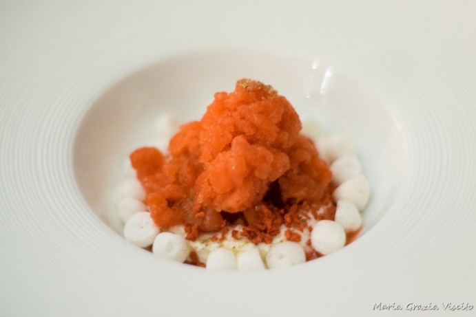 Albanella di molluschi, crostacei ed erbe aromatiche: per i detrattori dell’alta cucina, che la considerano solo esercizio di stile, questo piatto è la prova che la tradizione è uno dei cardini della cucina di livello. La vaso cottura, che poi ha origini antiche, dona un profumo che avvolge: il cameriere solleva il coperchio e il resto scompare. Il profumo del pesce, unito al basilico, all’aglio, alla carota, al pomodoro arriva intenso e allo stesso tempo delicato.